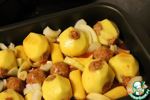Нафаршировать картофель фаршем и выложить в форму для запекания. Остатки фарша сформировать в виде фрикаделек.
