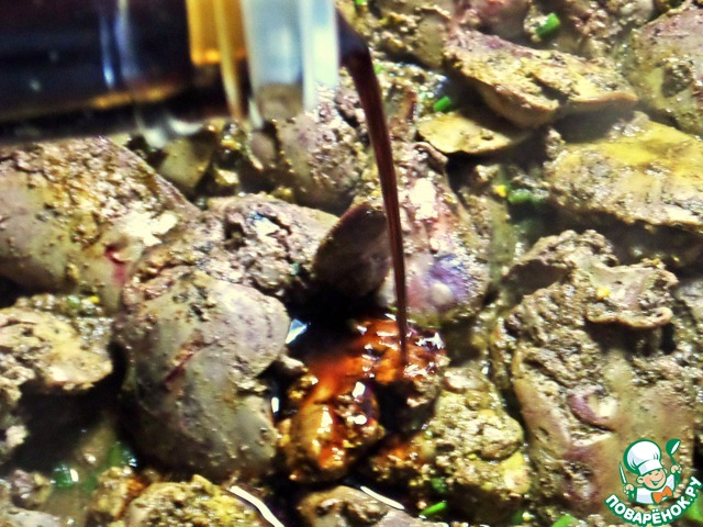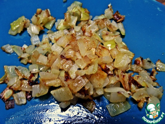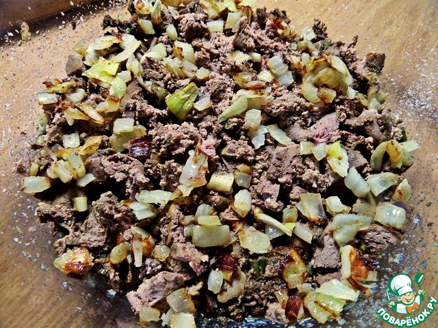 Заполняем дно печёночными кусочками, сверху-обжаренный лук.