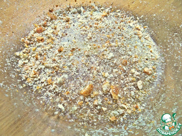 Берём форму ля запекания, смазываем маслом и насыпаем на дно домашние сухари из булки. У меня форма стеклянная, для СВЧ.