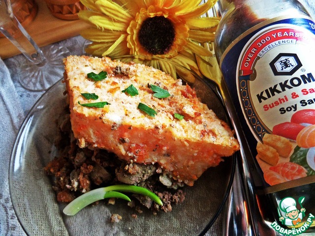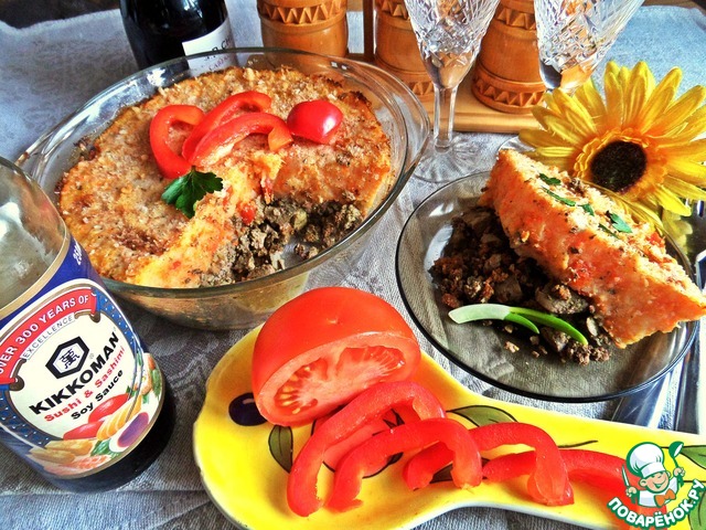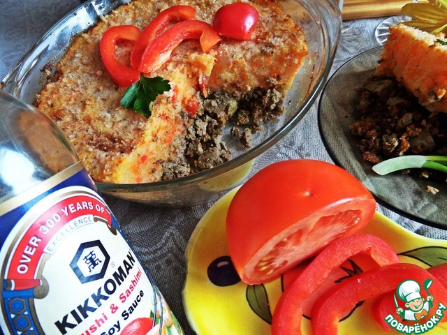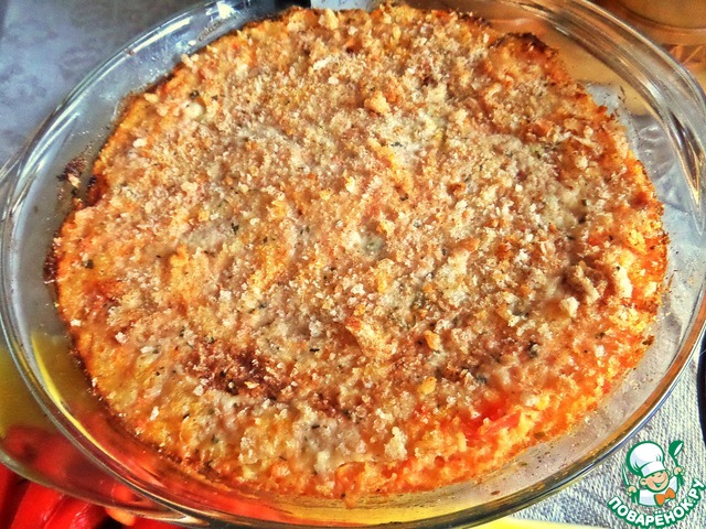 Смазываем верх сметаной или майонезом, ещё посыпаем сухарями для корочки.