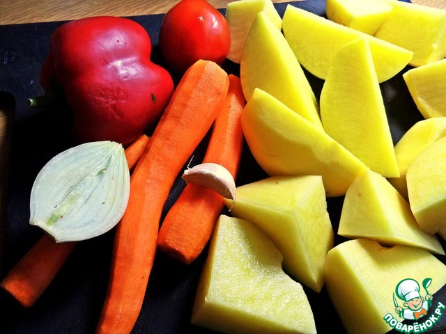 Картофель, морковь чистим, картошку делим для быстроты на доли.