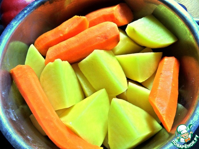 Картофель и морковь заливаем водой и ставим вариться, посолив.