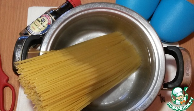 Не забываем про спагетти. Вода уже закипела, варим их в подсоленной воде.