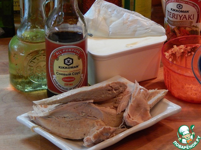 Мясо индейки порезать, добавить к нему соевый соус (у меня сладкий от "Киккоман"), лимонный сок, чеснок; поместить в блендер и измельчить.