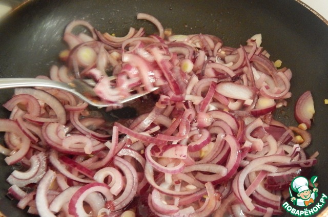 Обжариваем лук на сливочном масле, постепенно добавляя 2ст. л сахара