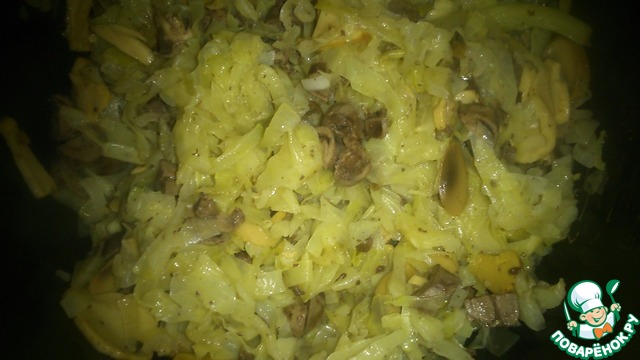 Добавляем капусту -солим, перчим начинку (обжариваем 2 минуты)