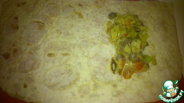 Берем лаваш (одну часть), выкладываем немного начинки чуть ближе к середине.