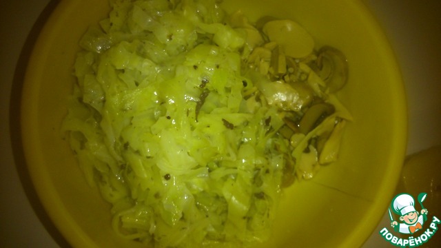 Шампиньоны, если они цельные-то необходимо их порезать поперек средними пластинами, а если резанные, то ничего делать не надо. капусту откинуть на дуршлаг, чтобы стекла вода (я для удобства разложили все в тарелки)