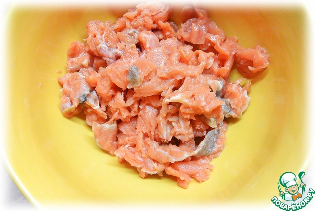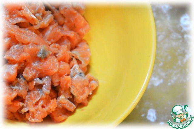 Поставить воду на плиту. Порезать кубиками рыбу и