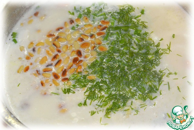 Отставить суп, добавить орешки, укроп и чеснок. Закрыть крышкой и дать настояться.