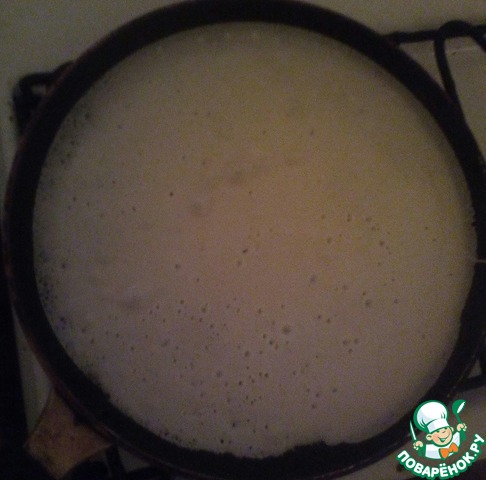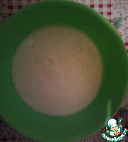 Добавляем молоко, соду и муку и тщательно перемешиваем пока не исчезнут комочки