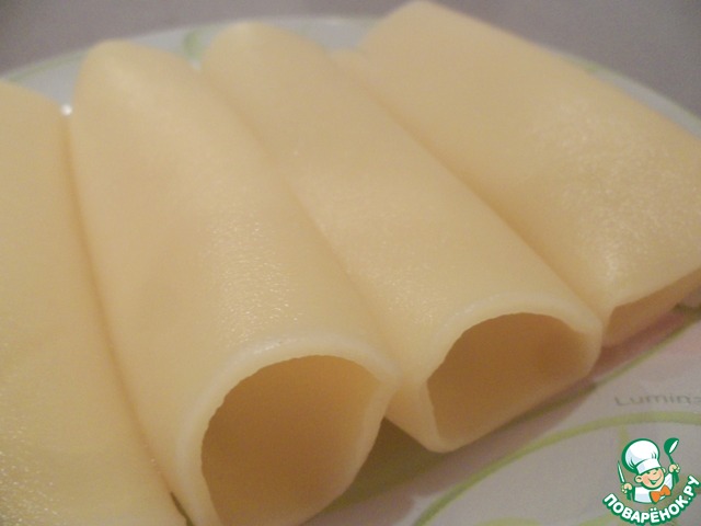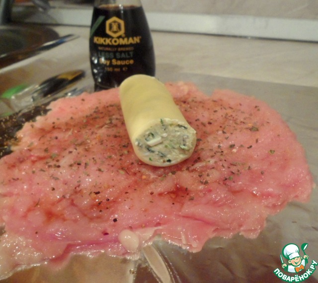 Начинить творожно-шпинатной массой каннеллони. Половинку грудки отбить, выложить ее на фольгу блестящей поверхностью кверху. Посыпать солью и специями. На середину выложить каннеллони. Мне кажется, что так аккуратнее получается нафаршировать грудку начинкой.