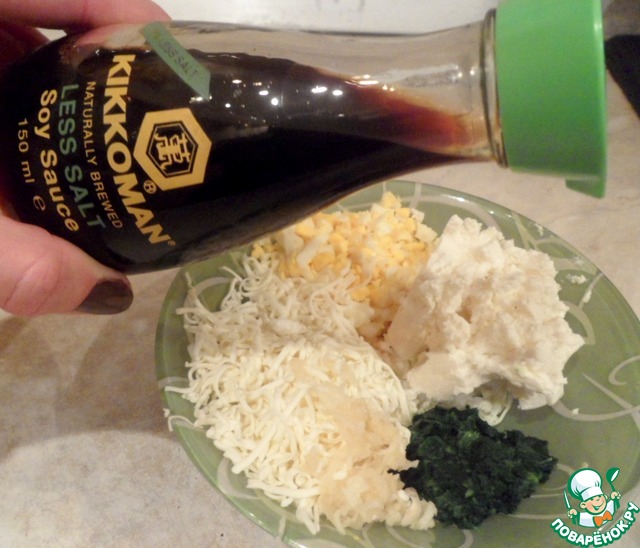 Натереть на мелкой терке плавленый сырок, вареное яйцо, чеснок. Перемешать все с размороженным шпинатом, творогом, добавить 2ст. л. соевого соуса ТМ «Киккоман» и соль по вкусу.