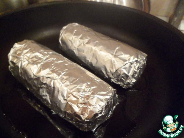 Свернуть все рулетом, завернуть в фольгу блестящей стороной внутрь, обжарить на сковороде с 4 сторон на сильном огне по 3-4 минуты, затем огонь убавить и обжаривать переворачивая, еще 15-20 минут до готовности. Снять с рулетов фольгу и подавать с зеленью. Приятного аппетита!