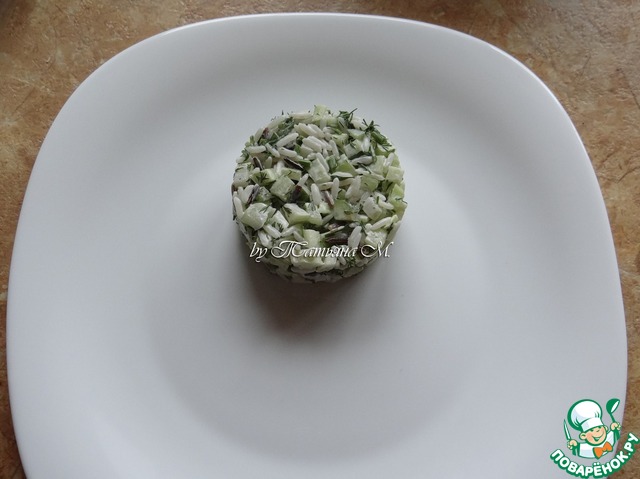Сельдерей, огурец, перец болгарский порезать кубиками, добавить рубленный укроп и рис;