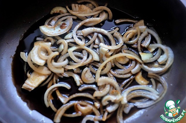 В сковороде довести до кипения соевый соус и добавить к нему лук. Тушить 3-4 минуты.