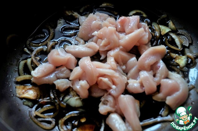 Тонкими полосками нарезать куриное филе и добавить к тушеному луку. Готовить еще 4-5 минут.
