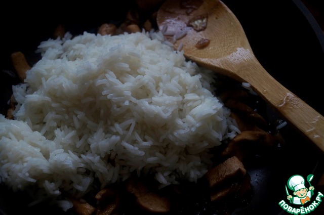 Вскрыть пакетики риса и выложить рис к луку с курицей, перемешать.
