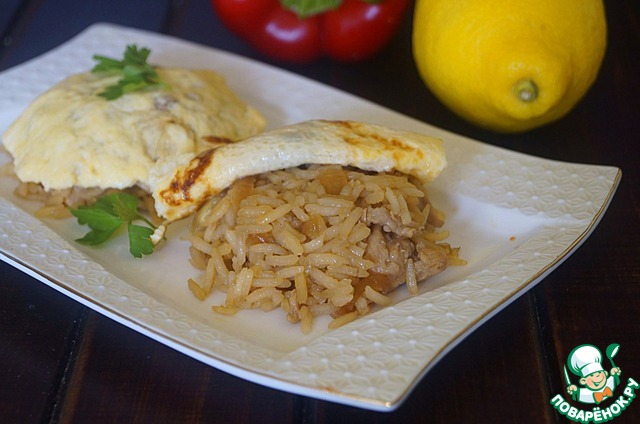 Приготовить тонкие омлеты из взбитых яиц. Рис разложить в пиалы, которые затем перевернуть на блюдо, убрать пиалы. Накрыть рис омлетом и подать к столу. Приятного аппетита!