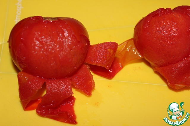 Помидоры залить кипятком на 1-2 мин, очистить от кожицы.