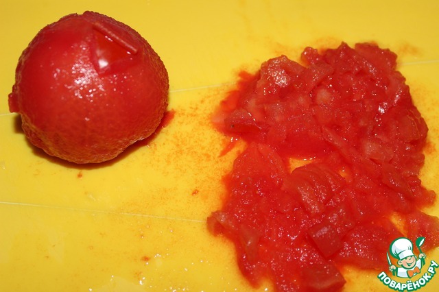 Помидоры мелко нарезать или подавить. Затем добавить к луку и довести до кипения.