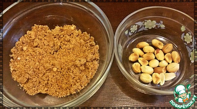 Арахис поджарить в микроволновой печи (минуты2) и очистить. Измельчить 20г арахиса любым удобным для Вас способом (я измельчала в кофемолке), а 10г арахиса оставить для украшения.