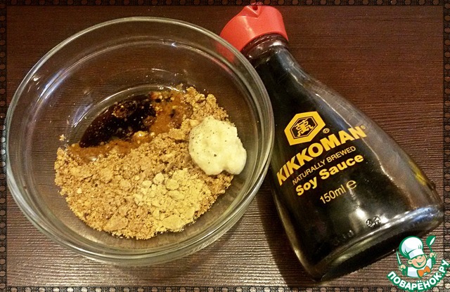 Для приготовления соуса в емкости смешать измельченный арахис, имбирь, хрен, растительное масло, соевый соус (я использовала ТМ Kikkoman), 2ст. л. молока и перец.