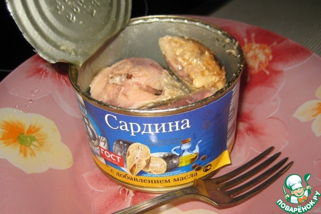 Пока рис варится, а тесто отдыхает в холодильнике, открываем банку сардин. Я сливаю масло и саму рыбу разминаю вилкой