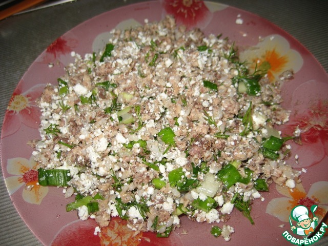 В начинку ввожу творог, соль и перец - буквально по щепотке, также к месту здесь будет соевый соус, 1-2 ч. л