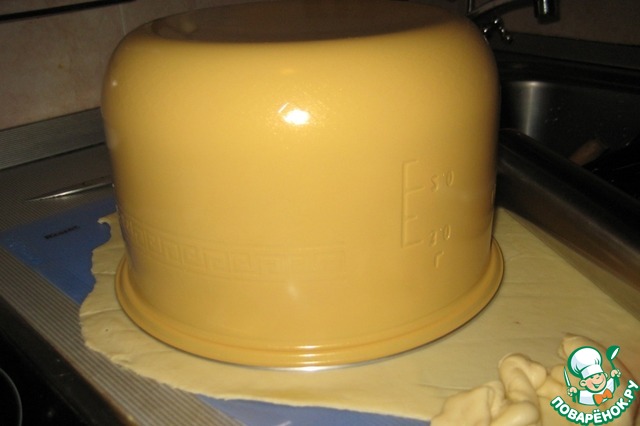 Для приготовления пирога я использую быстрое слоеное тесто по рецепту поваренка NataliM-2015 http://www.povarenok .ru/recipes/show/114 289/. Из приведенных в рецепте теста ингредиентов получится 2 моих пирога, поэтому здесь я указываю ровно то количество продуктов, что потребуется (отсюда и происходит 1/2 желтка).