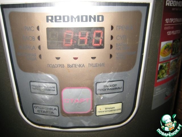 Теперь мультиварку включаем в режиме "Выпечка" на 55 минут, такое же время приготовления ставим на аэрогриле, температура 150 градусов.