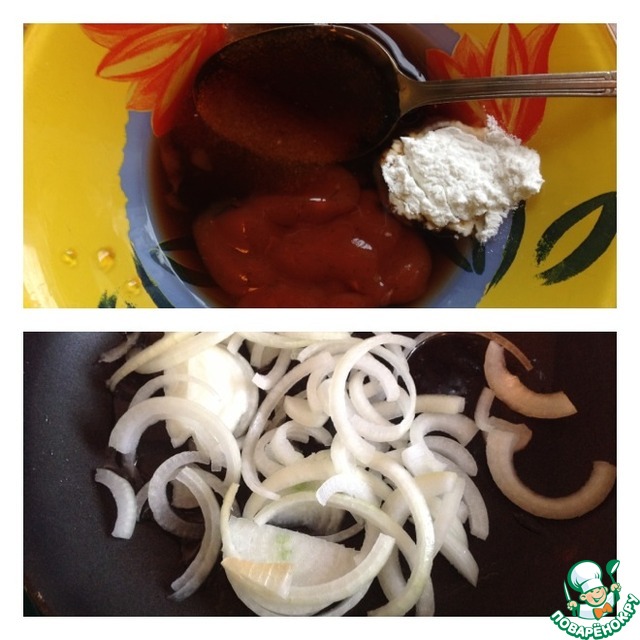 Делаем соус: смешиваем в пиале соевый соус, уксус, крахмал, сахар, томат пасту.