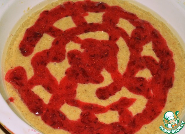 На смазанную форму выложить овсяное тесто (лучше делать в разъёмной, чего я, конечно, не сделала). Сверху выложить ягодную начинку, как угодно душе.