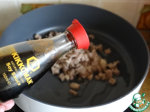 Обжарить на сильном огне с добавлением соевого соуса;