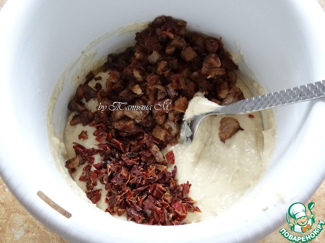 В тесто добавить утку и паприку - хорошо размешать;