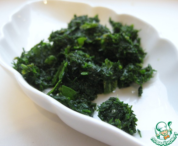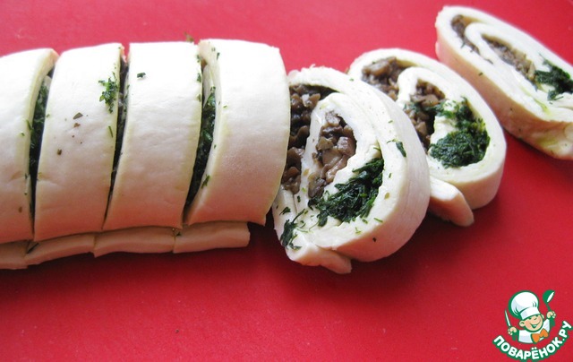 Слоеное тесто раскатать в прямоугольник размером 40 на 30. Разрезать по ширине на 2 равные части размером 20 на 30. На тесто выложить начинку. Я по центру выложила зелень, а по бокам - грибную начинку. Свернуть, начиная с длинной стороны. Положить в морозильник на 20 минут (можно заморозить для последующего использования). Затем нарезать тесто пластами шириной 1 см.