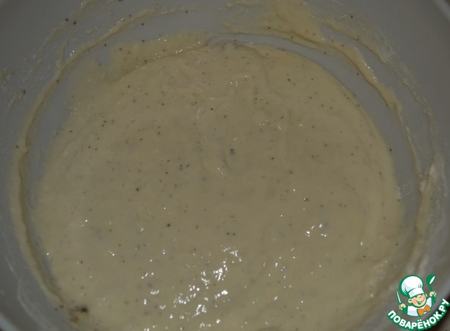 Далее добавляем разрыхлитель и муку, вымешиваем, получается тесто, как на оладьи, консистенция густой сметаны