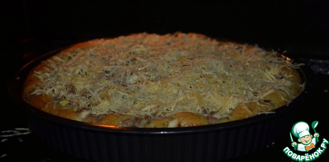 Как только края у пирога начнут румяниться, аккуратно выдвигаем, посыпаем верх сыром и ещё минут на 5, чтобы сыр растаял и чуть зарумянился. Я на это время низ духовки выключаю и зажигаю верх.