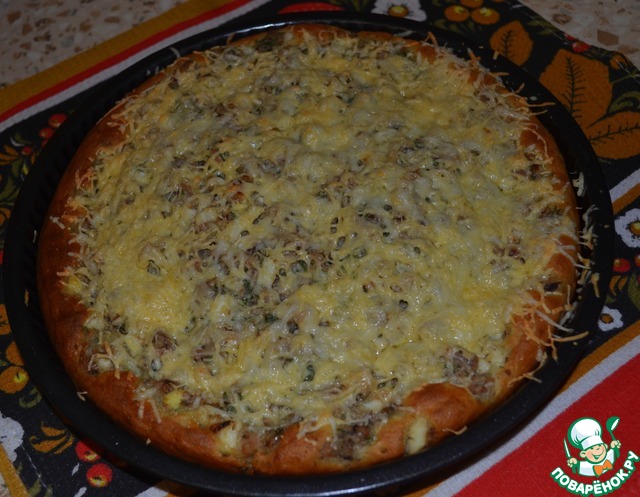 Ставим форму в разогретую до 180 градусов духовку, печётся достаточно быстро, минут 20. Пока пирог в духовке, натираем сыр на мелкой тёрке.