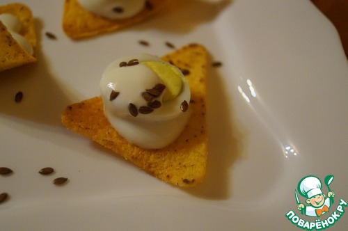 Эспуму выложить в менажницу, посыпать семенами льна и подавать с перепелиными яйцами и кукурузными чипсами. Можно подать закуску порционно: на начосы выложить немного эспумы, затем сверху положить половинки яиц, снова полить муссом и посыпать льном.