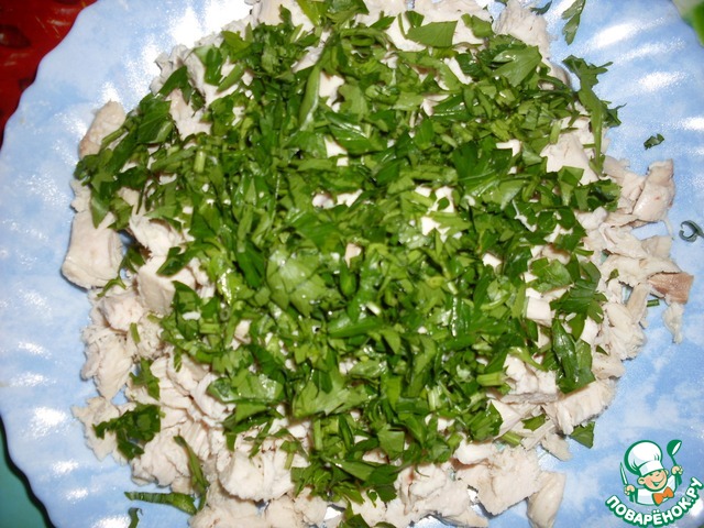 Отваренное куриное филе или другие части отварной курицы нарезаем кусочками