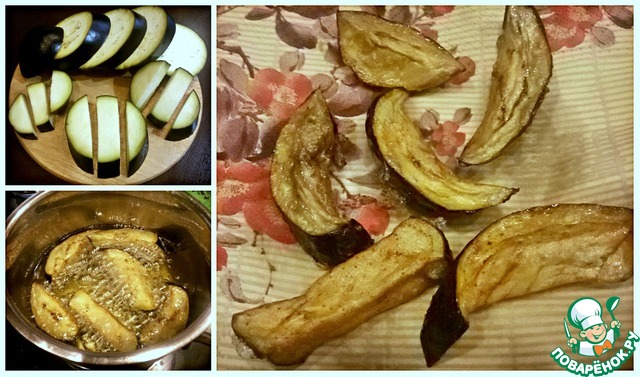 Крупно порезать баклажаны, посолить, оставить на 15-20мин. и затем отжать их от влаги. Это поможет меньше впитаться жиру. К баклажанам добавить белок, крахмал и тщательно перемешать (желательно рукой). Обжарить во фритюре и положить на бумажное полотенце.