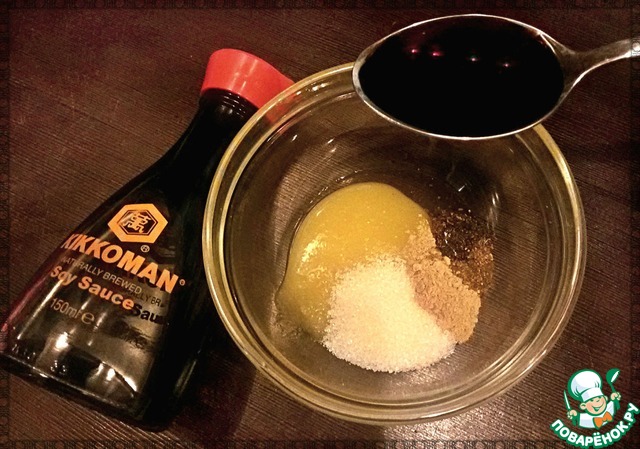 В емкости соединить мед, сахар, имбирь, кориандр, растительное масло, соевый соус (я использовала ТМ Kikkoman) и перемешать до однородности.