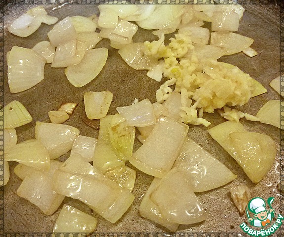 Лук порезать крупно, обжарить до золотистого цвета, добавить измельченный чеснок и подготовленный соус. Перемешать, протушить минуты 2 и выключить плиту.