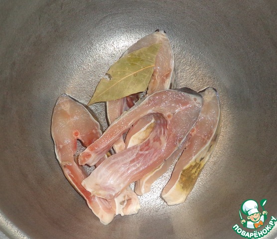 Рыбное филе кладем в кастрюлю, добавляем лавровый лист и перец горошек. У меня рыба кусочками, я ее отвариваю и выбираю косточки.