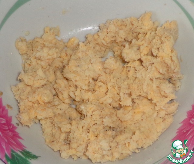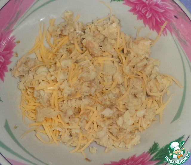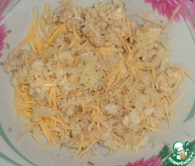 Рыбное филе размять вилкой и соединить с тертым сыром (мелкая терка).