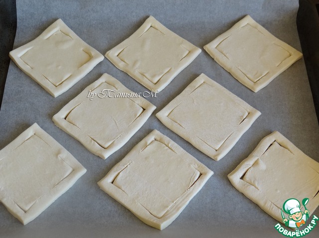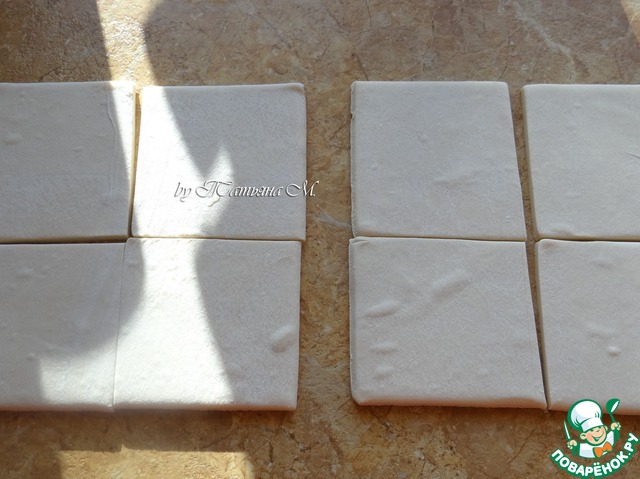 Пласты теста чуть разморозить (не до конца, чтобы хорошо резалось), разрезать на 8 квадратов;