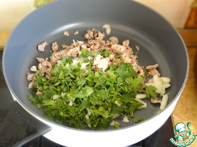 Сковороду смазать маслом, выложить утку, шинкованный лук и зелень (у меня петрушка+кинза);