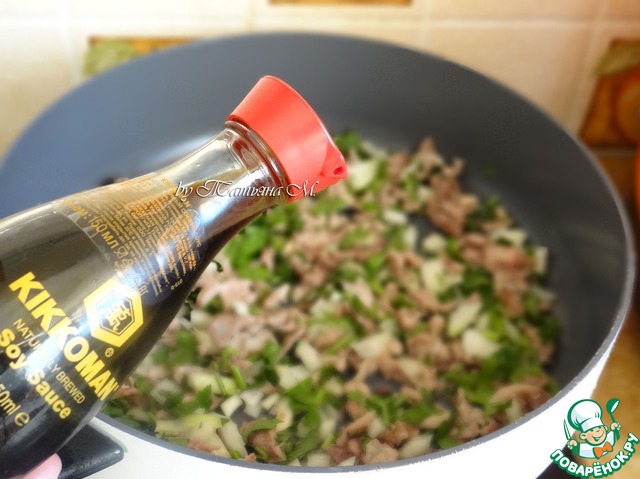Влить соевый соус и обжаривать до готовности лука 1-2 минуты;