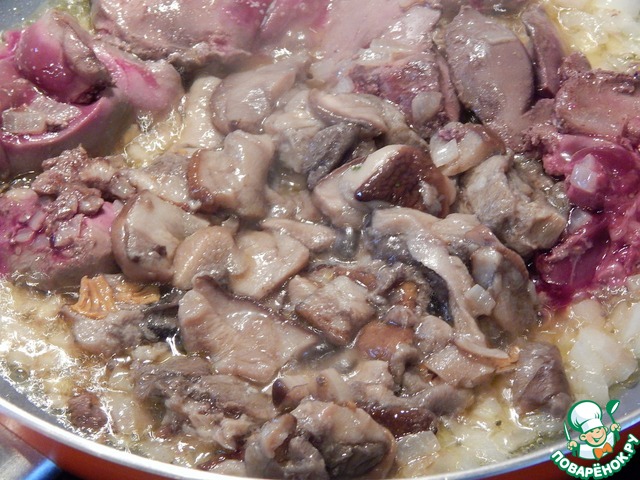 Добавляем грибы (у меня белые). Все вместе хорошенько обжариваем до готовности печени минут 5-7. Готовую печень вынимаем и мелко нарезаем.